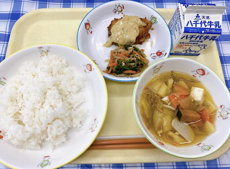 ごはん、チキン南蛮、ほうれん草のおひたし、ざぶ汁、牛乳