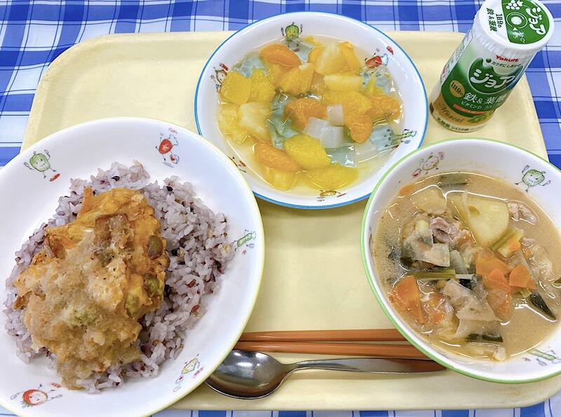 雑穀ごはん、夏野菜のかき揚げ丼(具)、具だくさん味噌汁、サイダーゼリーポンチ、ジョア(白ブドウ)