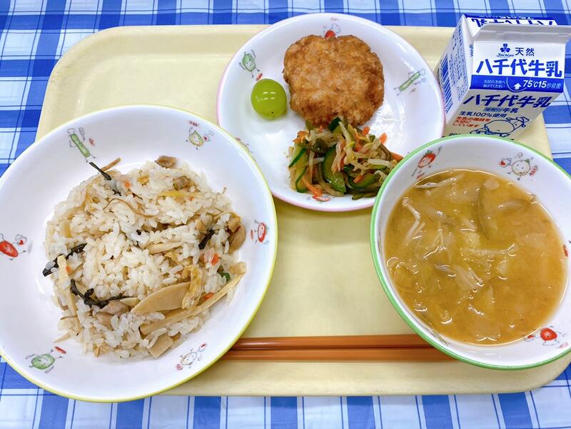 山菜ごはん、豆腐のふわふわ揚げ、茎わかめの和え物、じゃがいもの味噌汁、シャインマスカット、牛乳