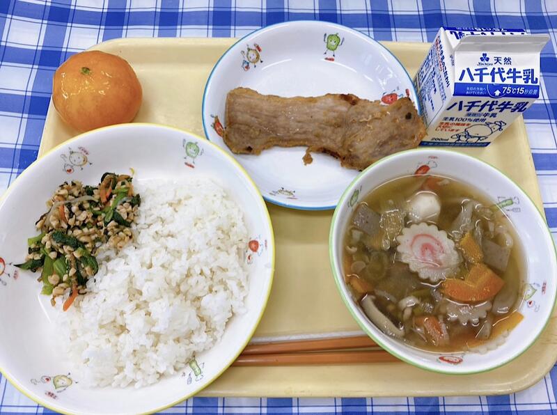 ごはん、納豆和え、豚肉の味噌漬け、のっぺい汁、冷凍みかん、牛乳