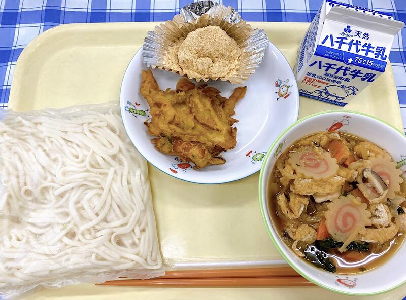 うどん、きつねうどん(具)、いか入りかき揚げ、きな粉おはぎ、牛乳