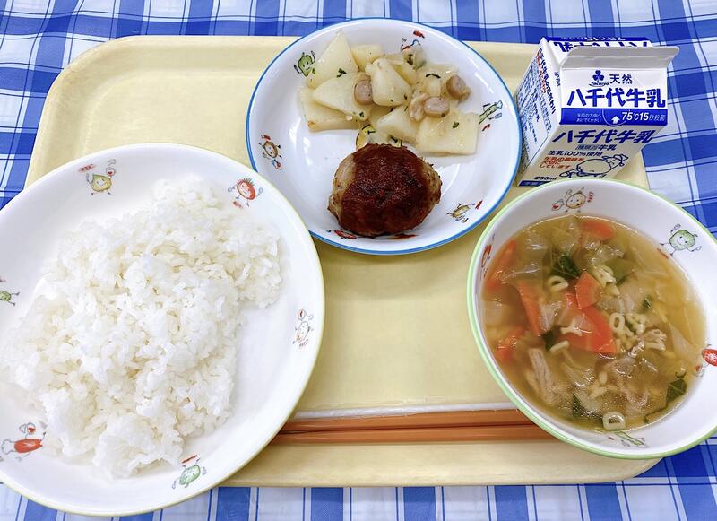 ごはん、ハンバーグ、ブラートカルトッフェルン、ABCスープ、牛乳