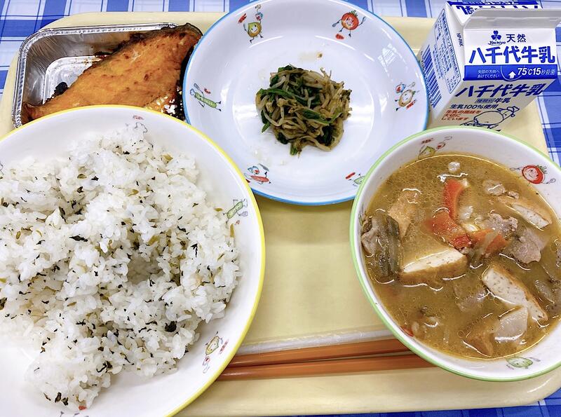 菜めし、鮭のもみじ焼き、のり和え、豚肉と生揚げの味噌汁、牛乳