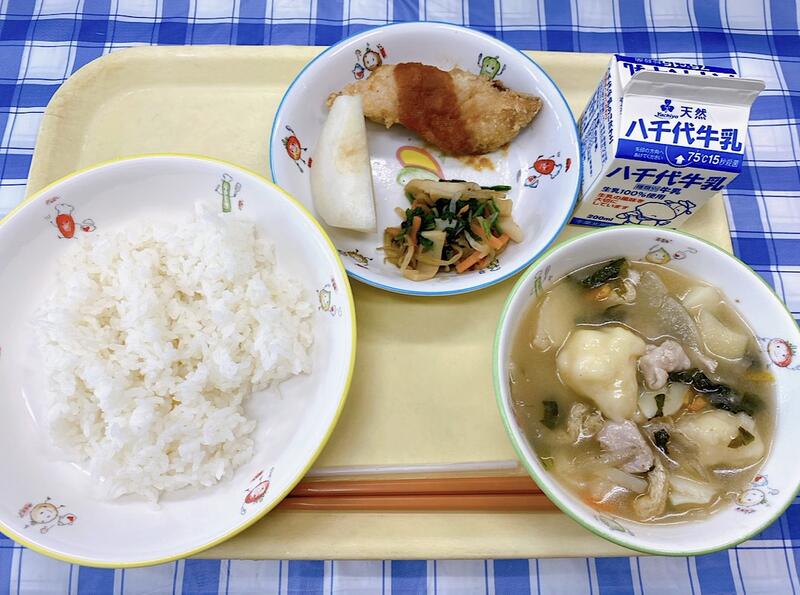 ごはん、ぼらの味噌から揚げ、からし和え、きび団子汁、市川の梨、牛乳