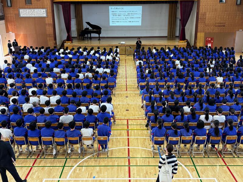 本日は、全校集会を行いました。本校では、定期的に全校集会を行っていますが、今年度初めての全学年そろっての集会でした。企画や運営は、生徒会本部が取り組んでくれました。