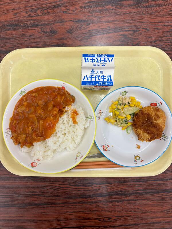今日のメニューは、ミラノ風ドリア、チキンアドボ、フレンチサラダ、コンソメスープ、牛乳です。