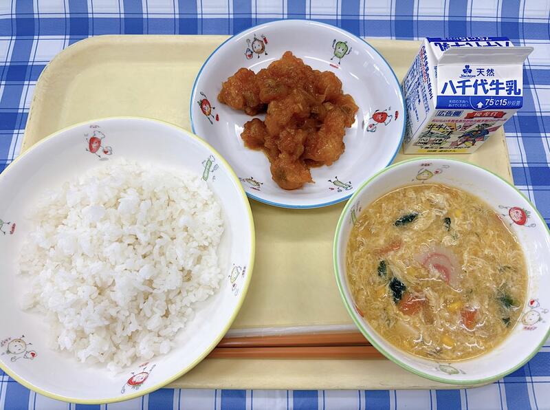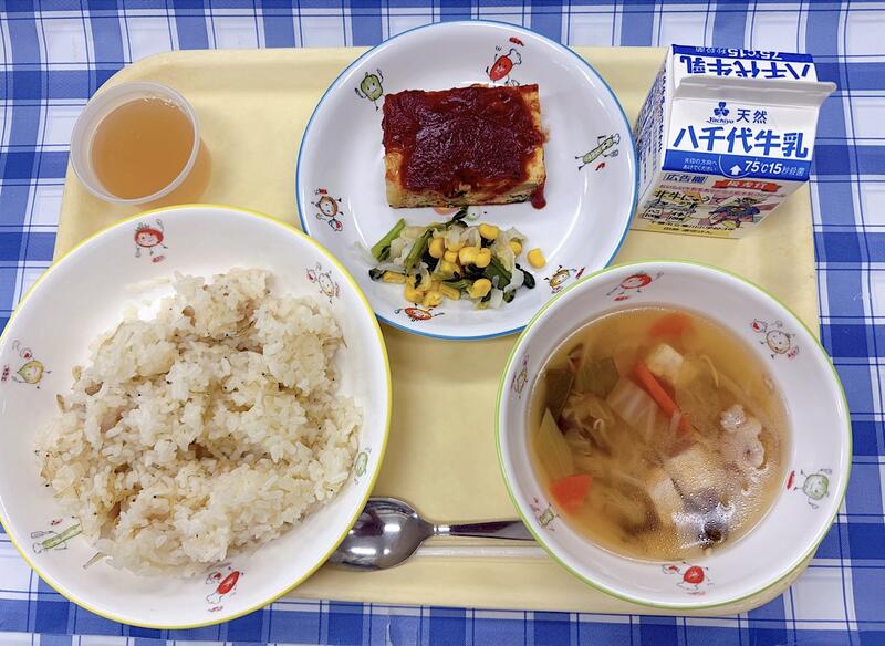 今日のメニュー ツナチャーハン 揚げ餃子 春雨サラダ わかめスープ 牛乳