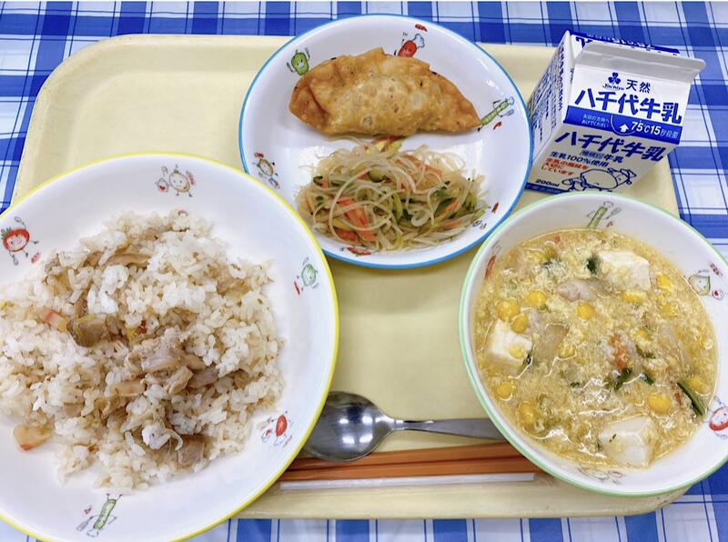 五目チャーハン、ツナぎょうざ、春雨サラダ、コーン卵スープ、牛乳