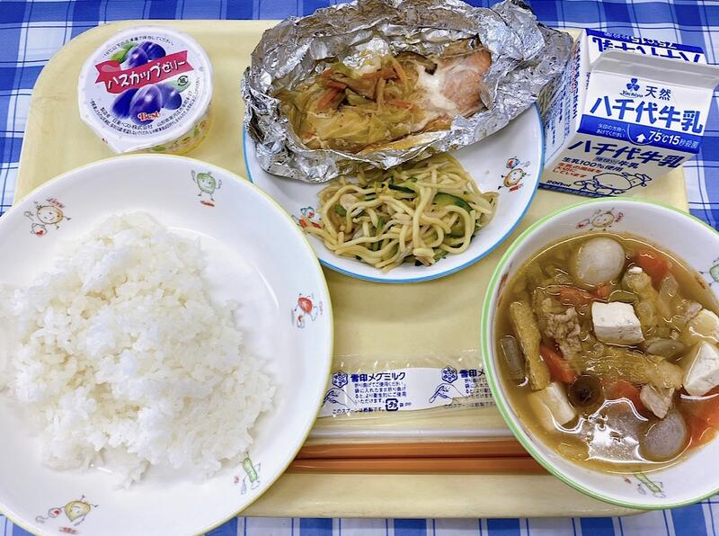 ごはん、鮭のちゃんちゃん焼き、ラーメンサラダ、豚けんちん汁、ハスカップゼリー