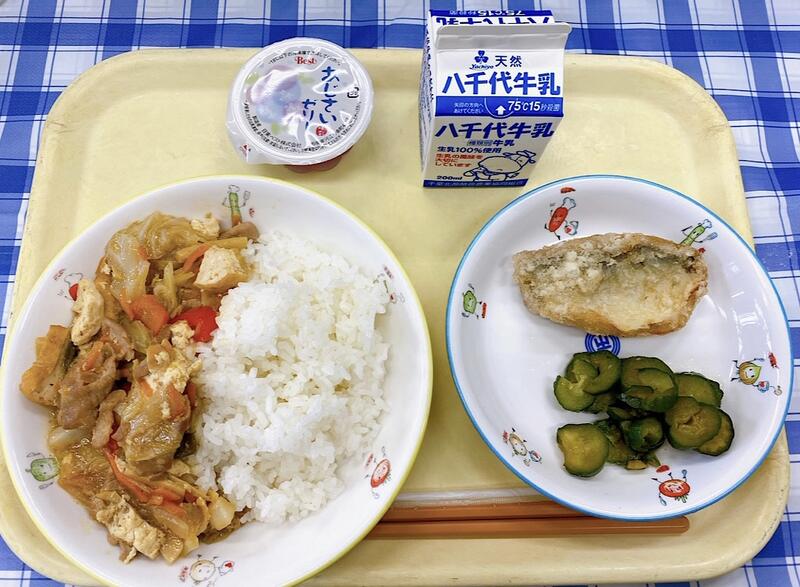 ごはん、ホイコーロー丼(具)、あじのから揚げ、中華きゅうり、あじさいゼリー、牛乳