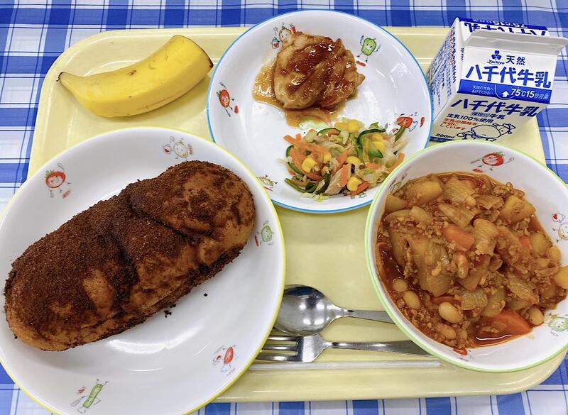 ココア揚げパン、マーマレードチキン、茎わかめツナサラダ、チリ・コン・カン、バナナ、牛乳