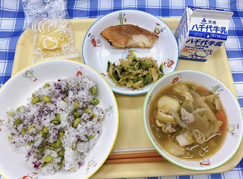 ゆかり枝豆ごはん、赤魚の味噌焼き、ごま和え、すいとん、冷凍りんご、牛乳