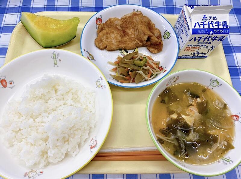 ごはん、豚肉のかりんとう揚げ、ごぼうサラダ、わかめと生揚げの味噌汁、メロン