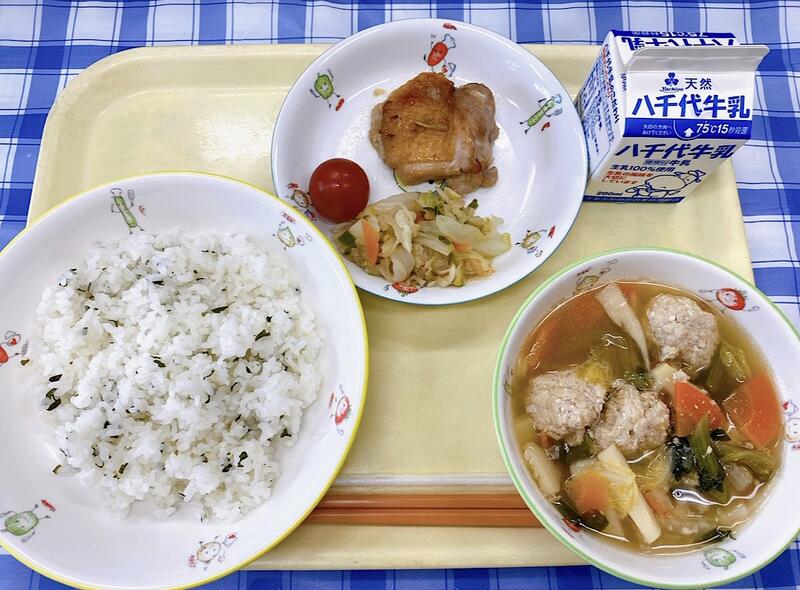わかめごはん、鶏肉の香味焼き、ミニトマト付き大根サラダ、豆腐だんごのすまし汁、牛乳