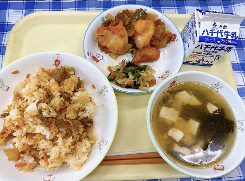 キムチごはん、ホキと野菜のケチャップ和え、チョレギサラダ、わかめスープ、牛乳