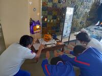 下中の職員玄関の近くに、ALTの先生がハロウィンの飾りをしてくれました。その中で現在、カボチャの重さを予想するイベントを開催しています。