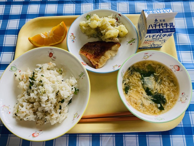 菜の花ごはん、赤魚の西京焼き、かき玉汁、ジャーマンポテト、伊予柑、牛乳