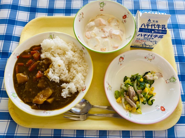 麦ごはん、ポークカレー、ドレッシングサラダ、ヨーグルトクリーム、牛乳