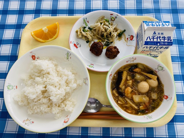 麦ごはん、八宝菜、肉団子の甘酢あんかけ、もやし和え、ネーブルオレンジ、牛乳