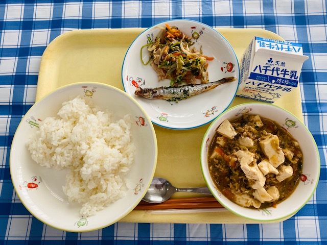 ごはん、麻婆豆腐、シシャモ磯焼き、豆苗の中華和え、牛乳