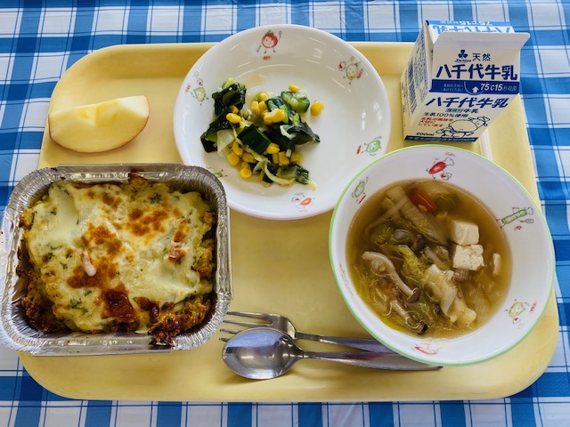 カレードリア、わかめサラダ、白菜スープ、りんご、牛乳