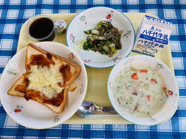 ピザトースト、クラムチャウダー、森のきのこサラダ、コーヒーゼリー、牛乳