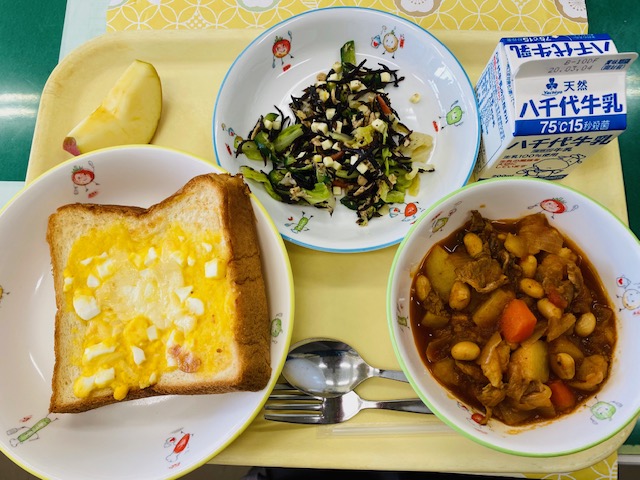 たまごトースト、ポークビーンズ、ひじきのサラダ、りんご、牛乳