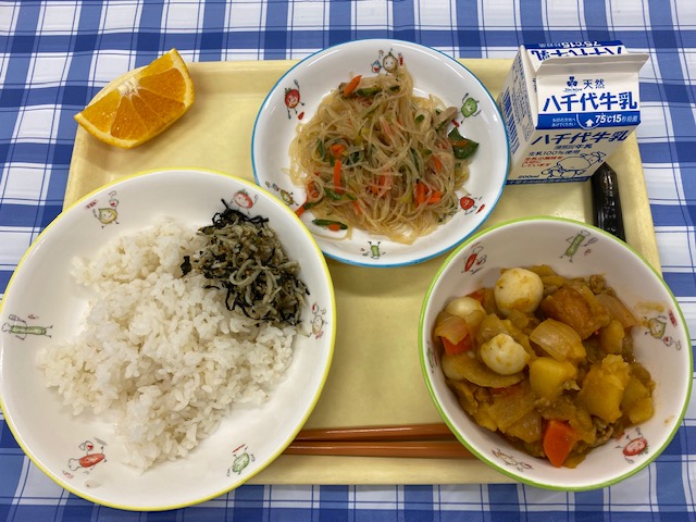 麦ごはん、小魚ふりかけ、インド煮、バンサンスー、オレンジ、牛乳、ミルメーク