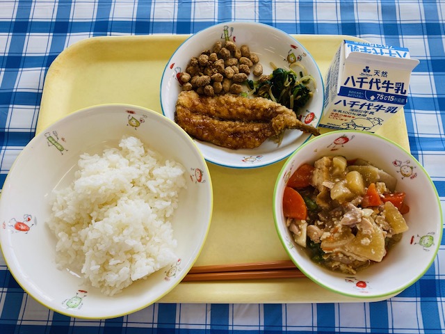 ごはん、イワシの蒲焼き、お煮しめ、おひたし、鬼打ち豆の黒砂糖がらめ、牛乳
