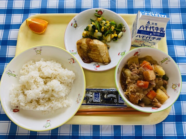 麦ごはん、味付け海苔、サバのねぎ味噌がけ、肉じゃが、おひたし、奄美たんかん、牛乳