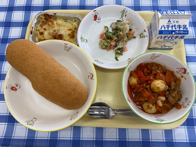 胚芽パン、カヴァルマ、ショブスカサラダ、ブルガリア風ポテト焼き、牛乳