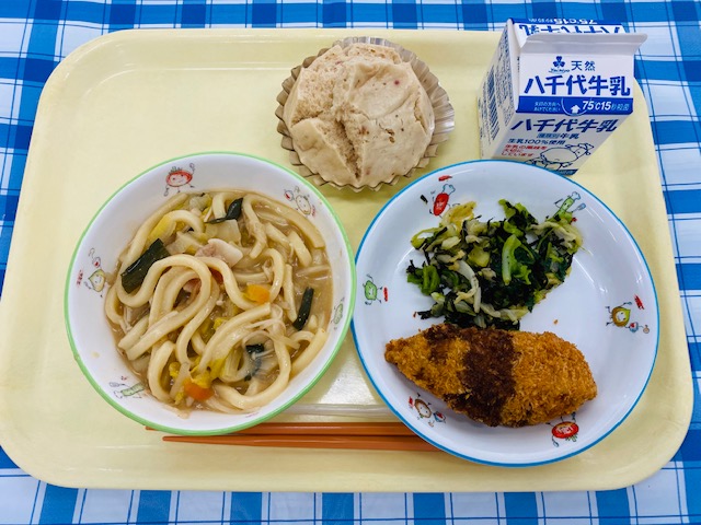 味噌煮込みうどん、鰤カツ、のり和え、いちご蒸しパン、牛乳