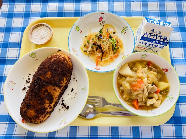 ココア揚げパン、洋風煮込み、春雨サラダ、ベークドチーズケーキ、牛乳