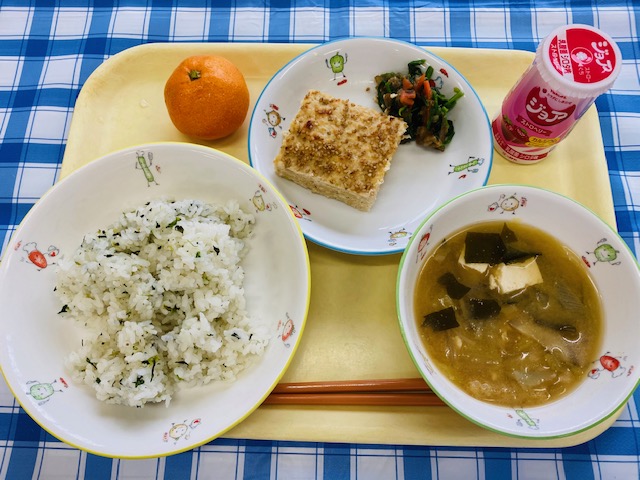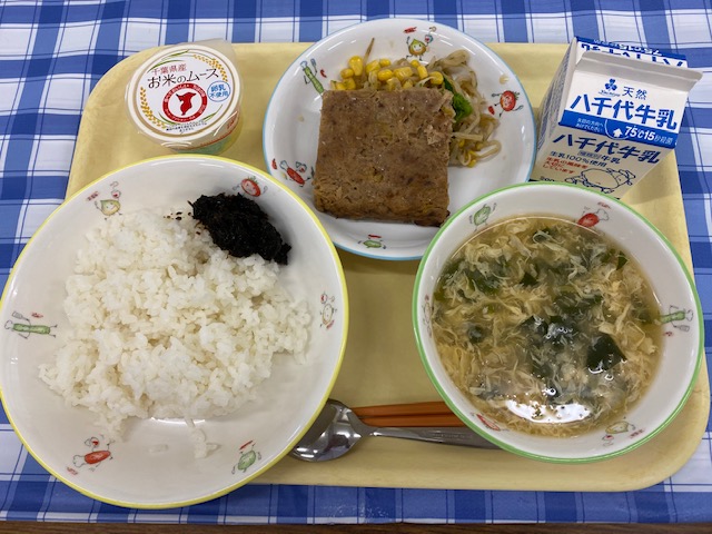 ごはん、市川のりの佃煮、鰯のさんが焼き、菜の花和え、かきたま汁、千葉県産お米のムース、牛乳
