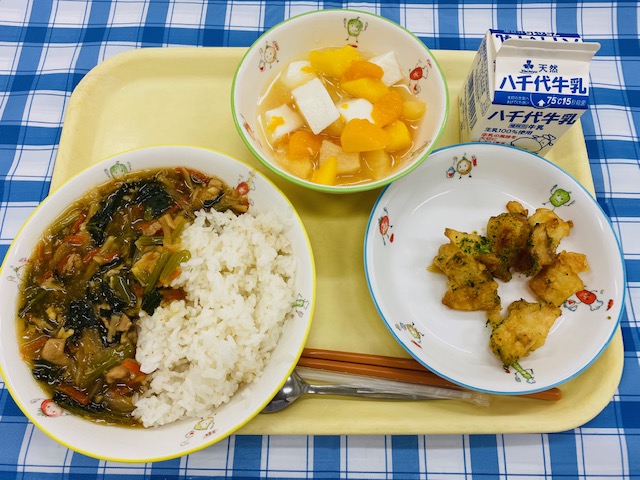 麦ごはん、青菜のあんかけ、みそポテト、杏仁フルーツ、牛乳