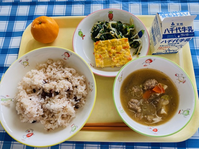 小豆ごはん、黄金焼き、つみれ味噌汁、柚香和え、ポンカン、牛乳