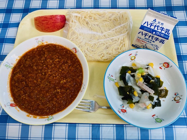 スパゲティー、ミートソース、ワカメと大根のサラダ、りんご、牛乳