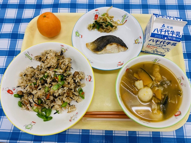 ひじきごはん、ホッケの文化干し、白玉団子汁、おひたし、ポンカン、牛乳