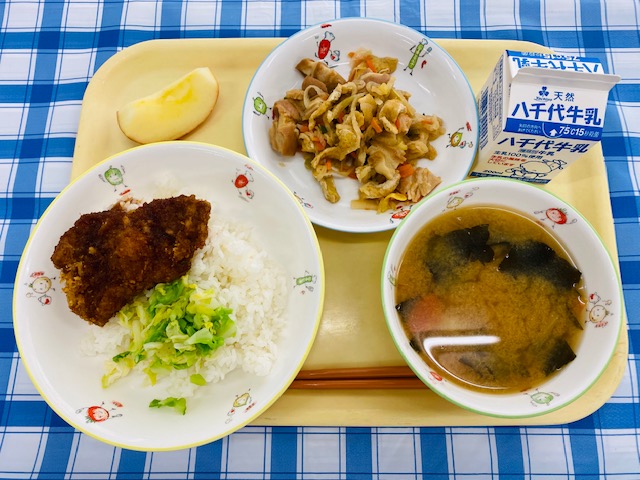 ソースカツ丼、引き菜炒り、味噌汁、りんご、牛乳