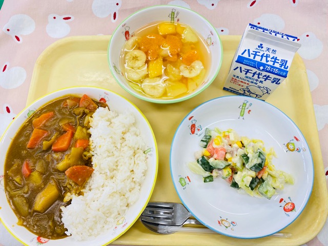 麦ごはん、ポークカレー、マセドアンサラダ、フルーツパンチ、牛乳