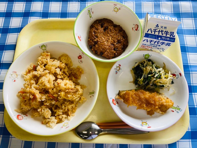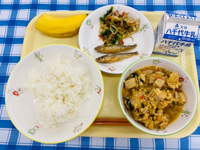 ごはん、あぶ玉煮、ワカサギの唐揚げ、洋風ごま和え、バナナ、牛乳