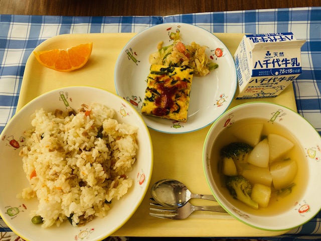 ハムピラフ、ほうれん草のキッシュ、じゃこサラダ、ポトフスープ、はるみ、牛乳