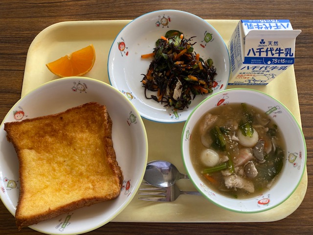 フレンチトースト、白玉雑煮、ひじきのマリネ、夢オレンジ、牛乳