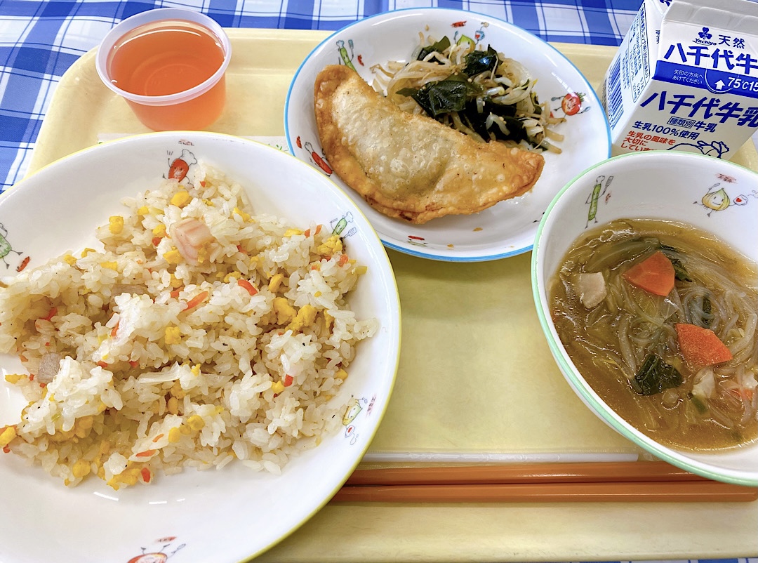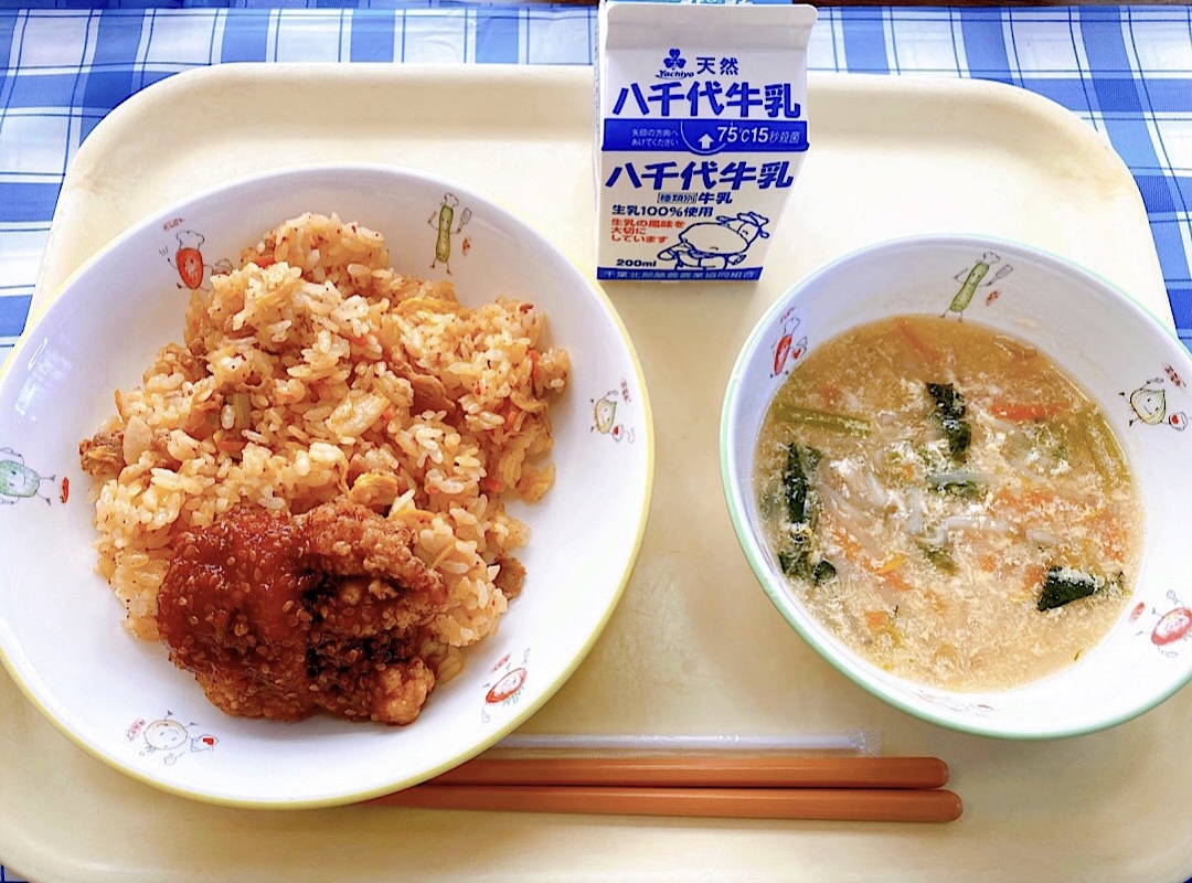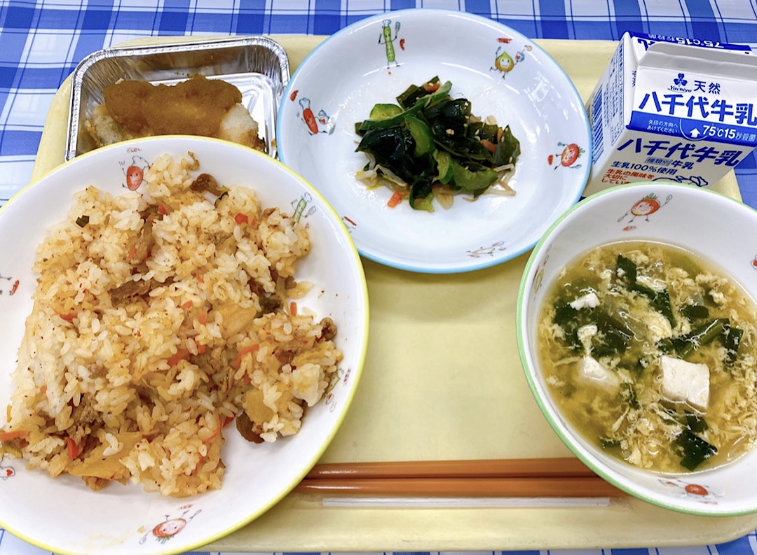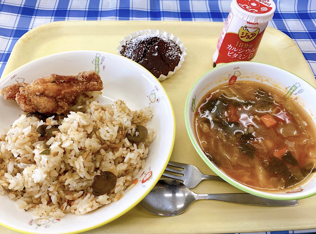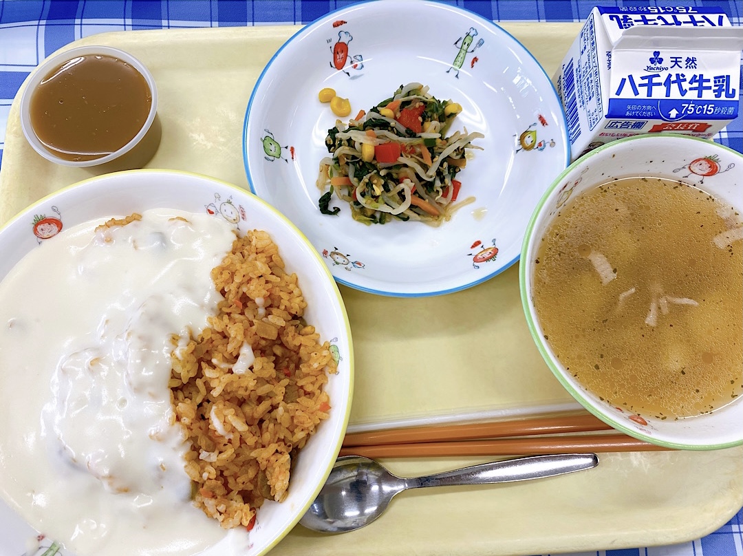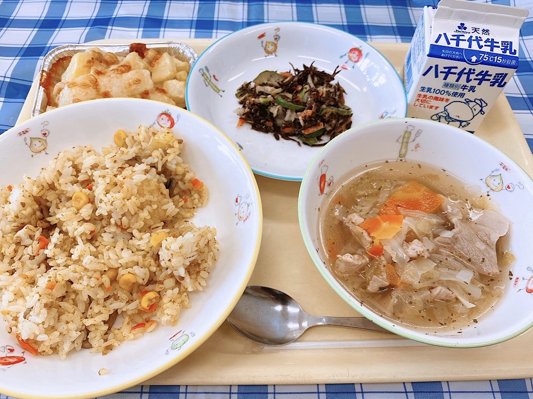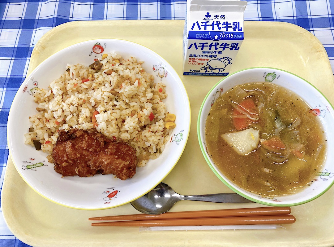ハムピラフ、いかのサラサ揚げ、コンソメスープ、牛乳