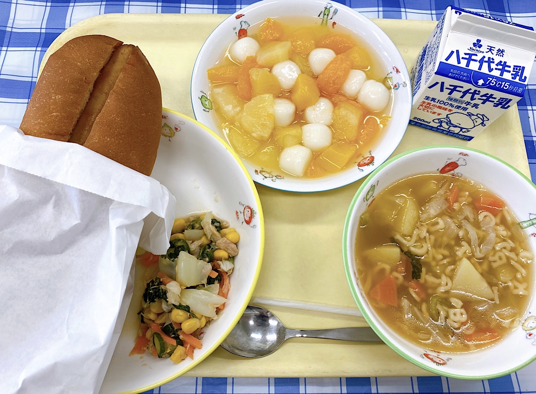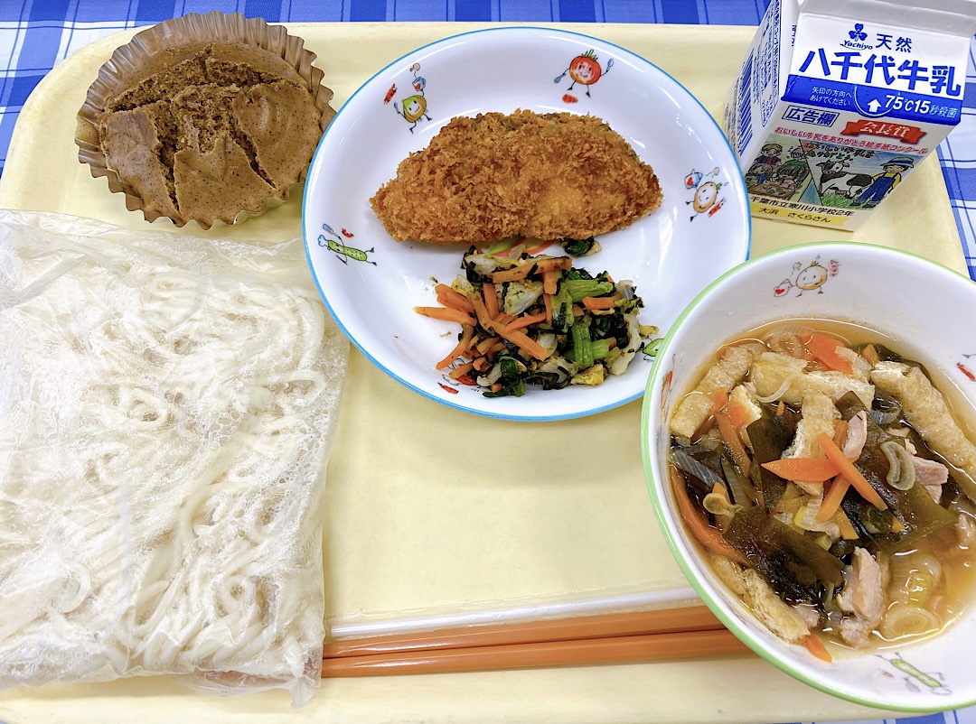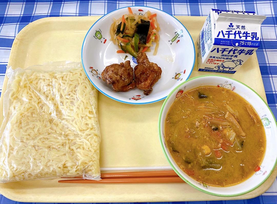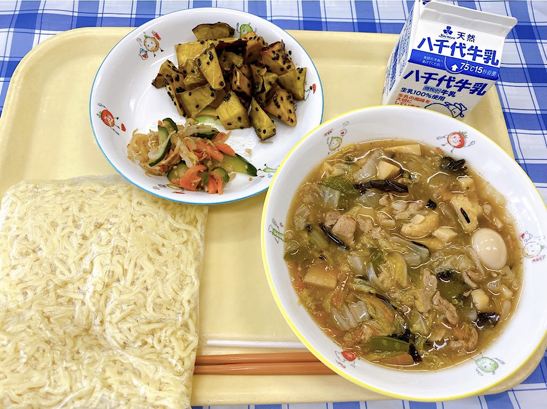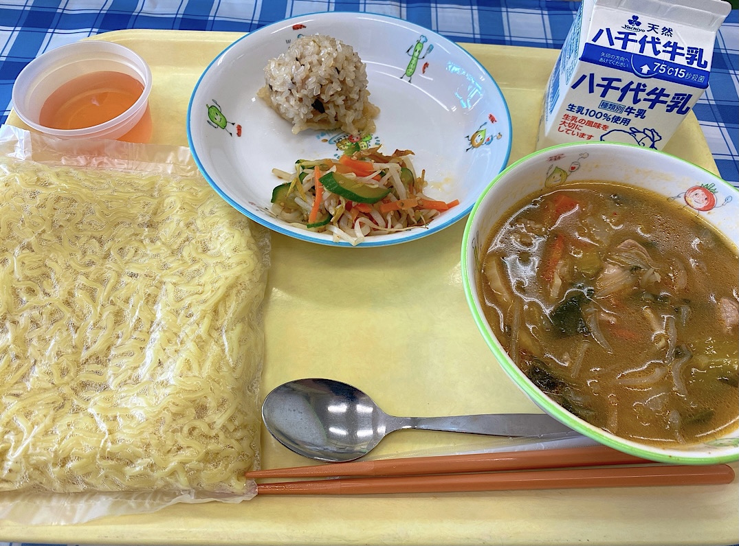 崖の上のポニョに登場する、ポニョが初めて食べたラーメンをイメージしました。劇中ではハムとゆで卵のシンプルなものですが、給食では栄養を考え、五目ラーメンにしました!