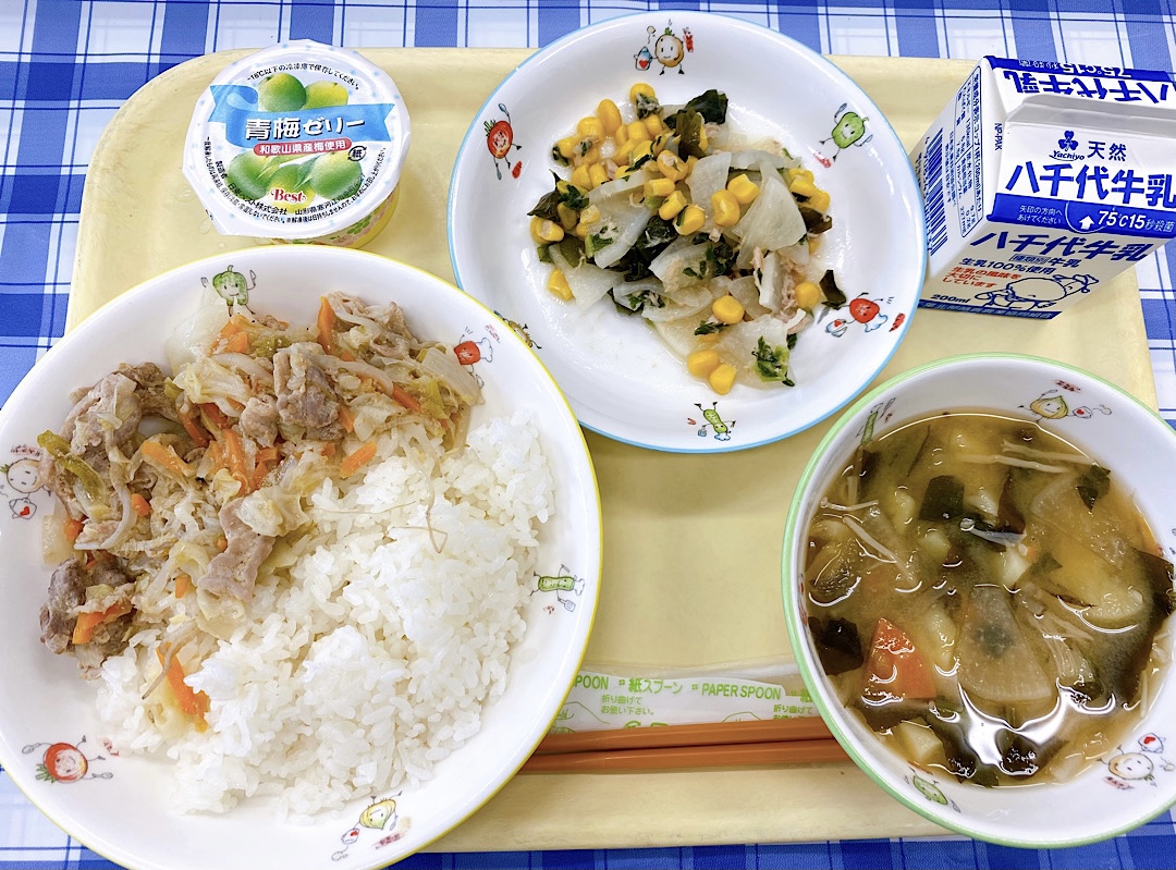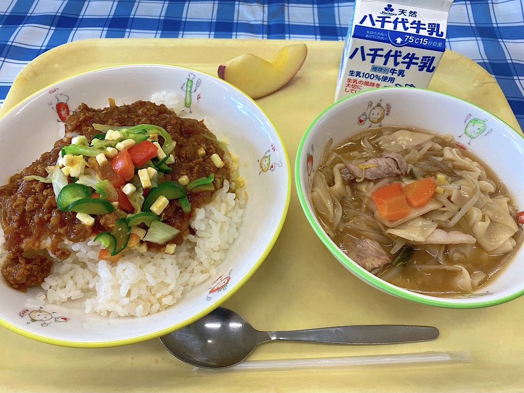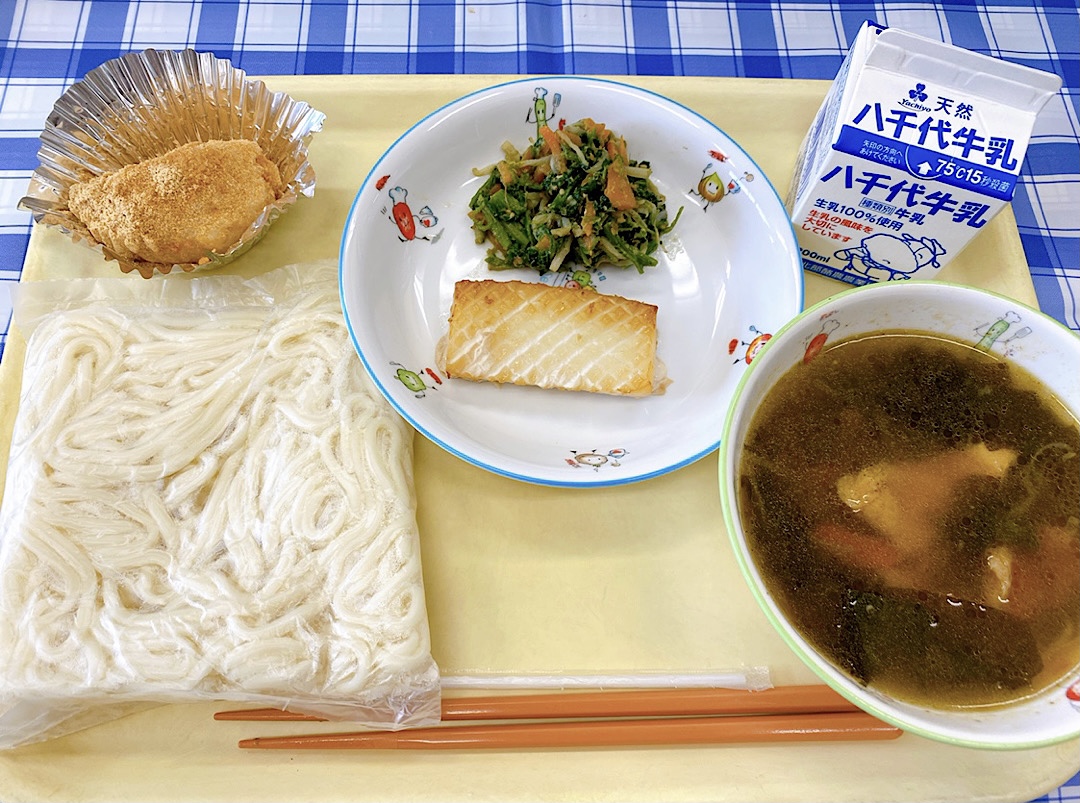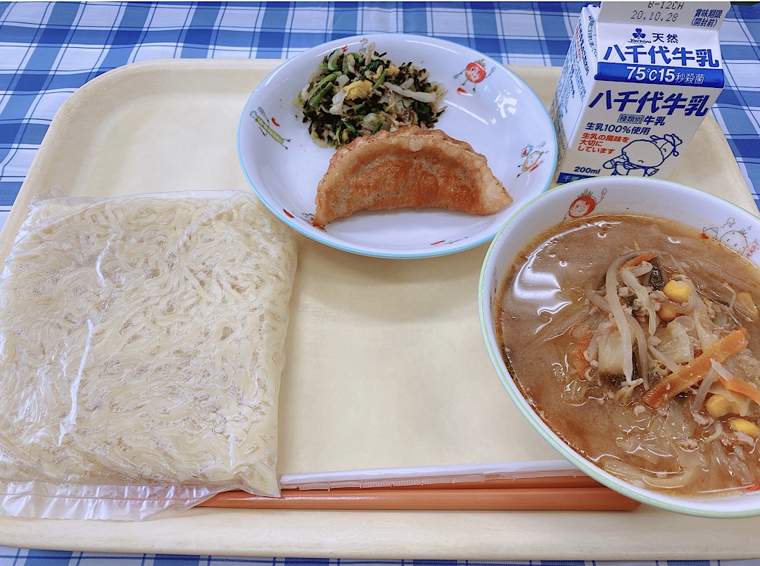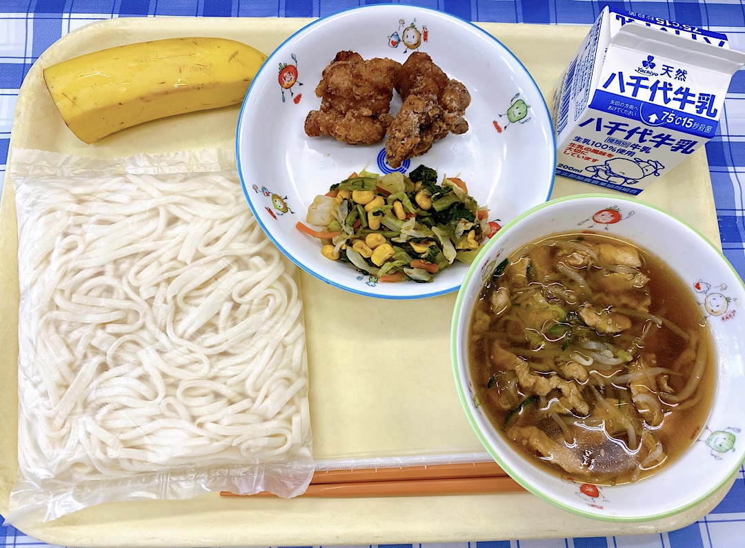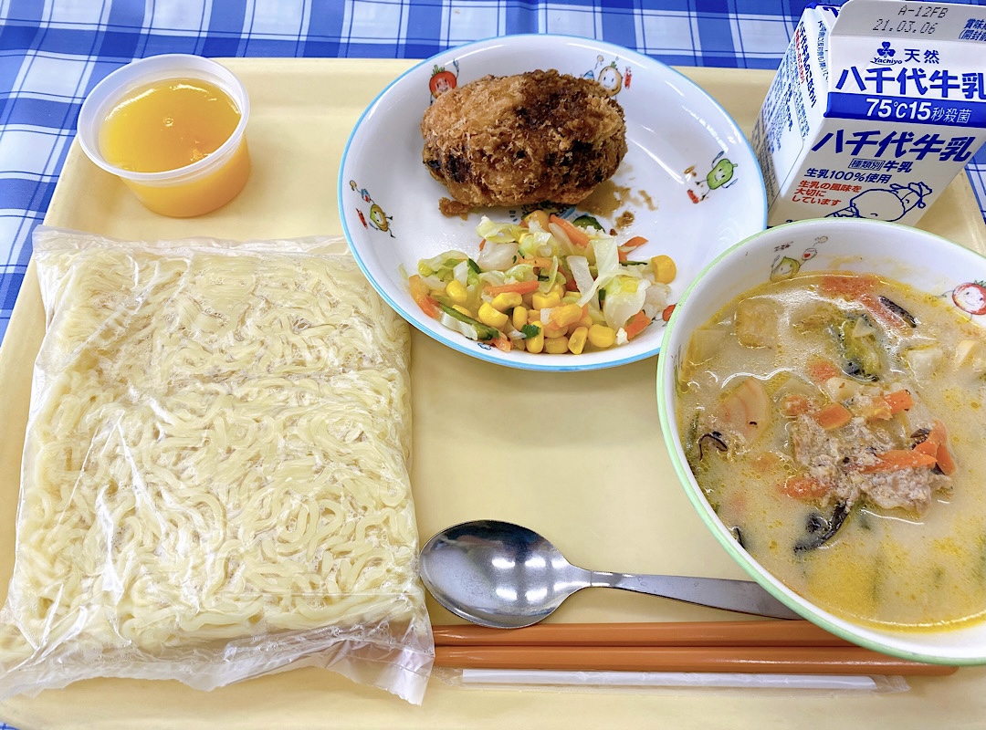 崖の上のポニョに登場する、ポニョが初めて食べたラーメンをイメージしました。劇中ではハムとゆで卵のシンプルなものですが、給食では栄養を考え、五目ラーメンにしました!