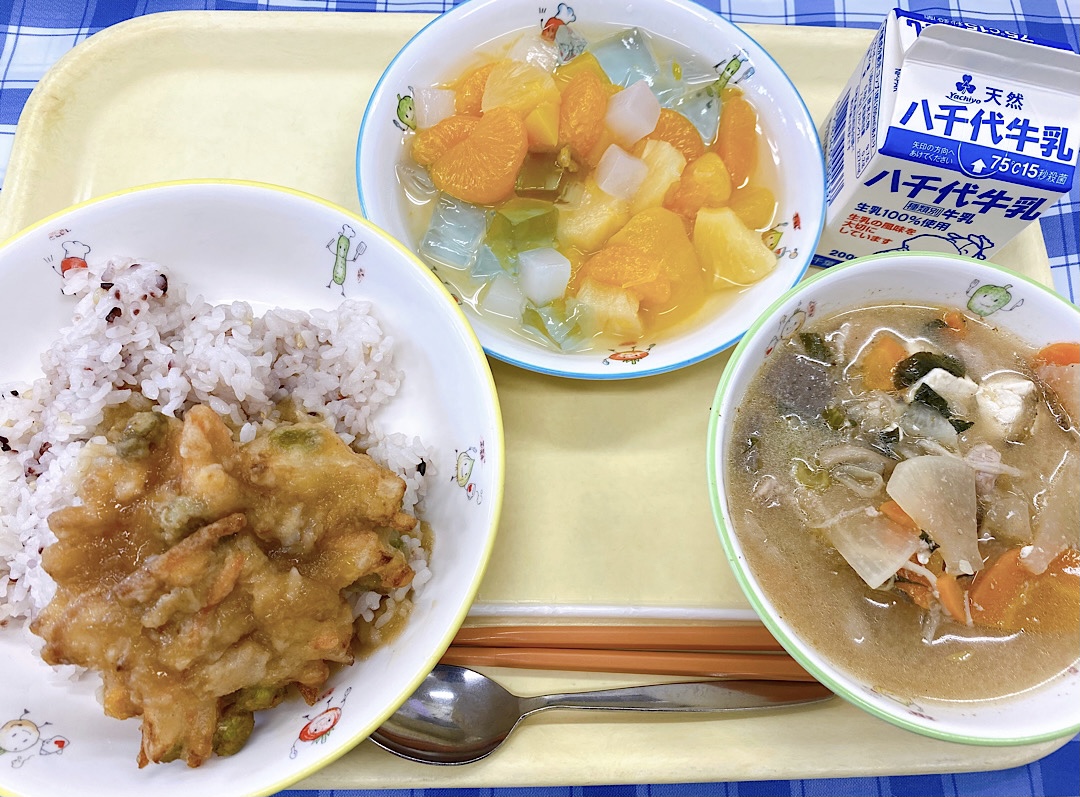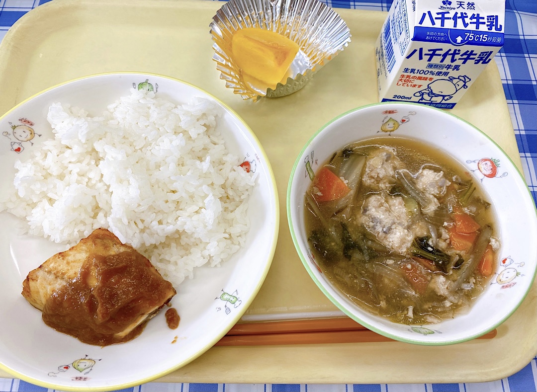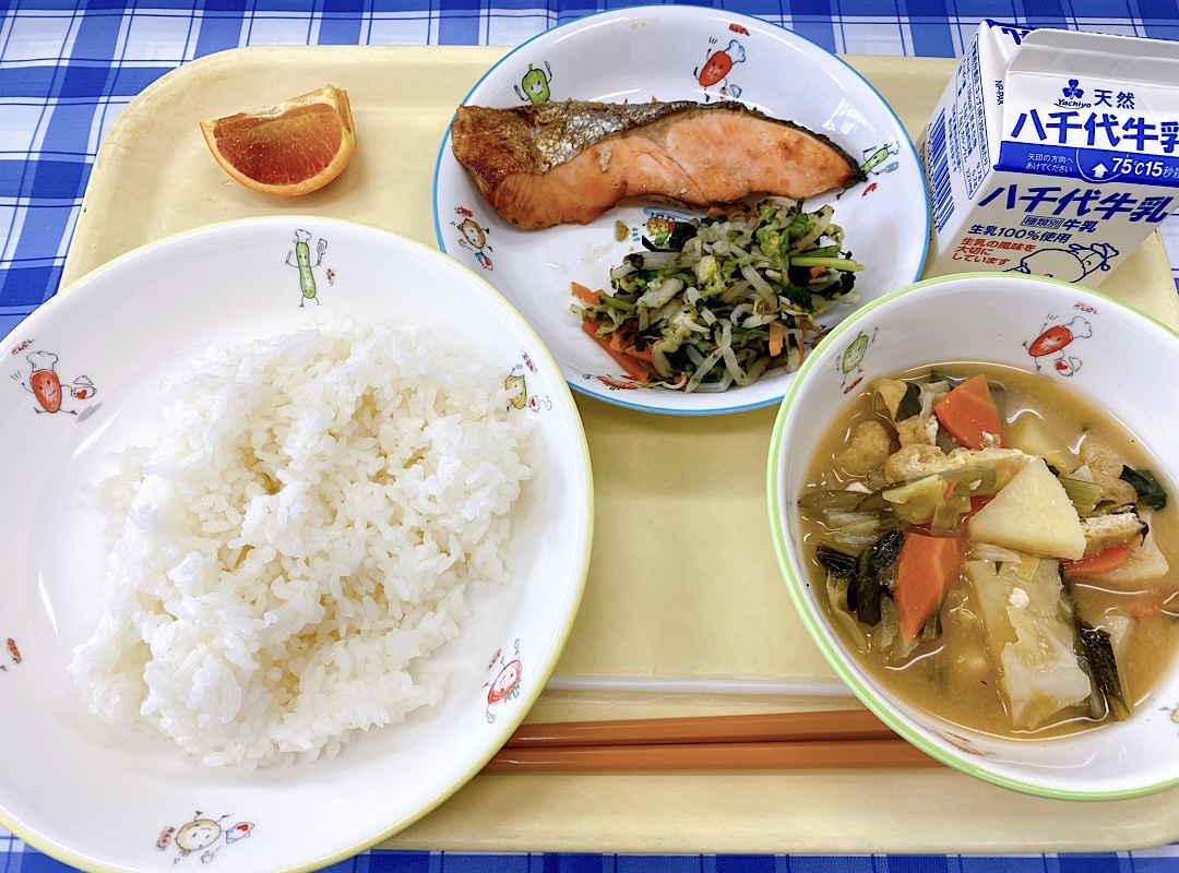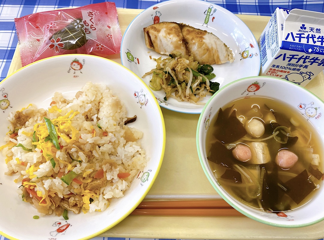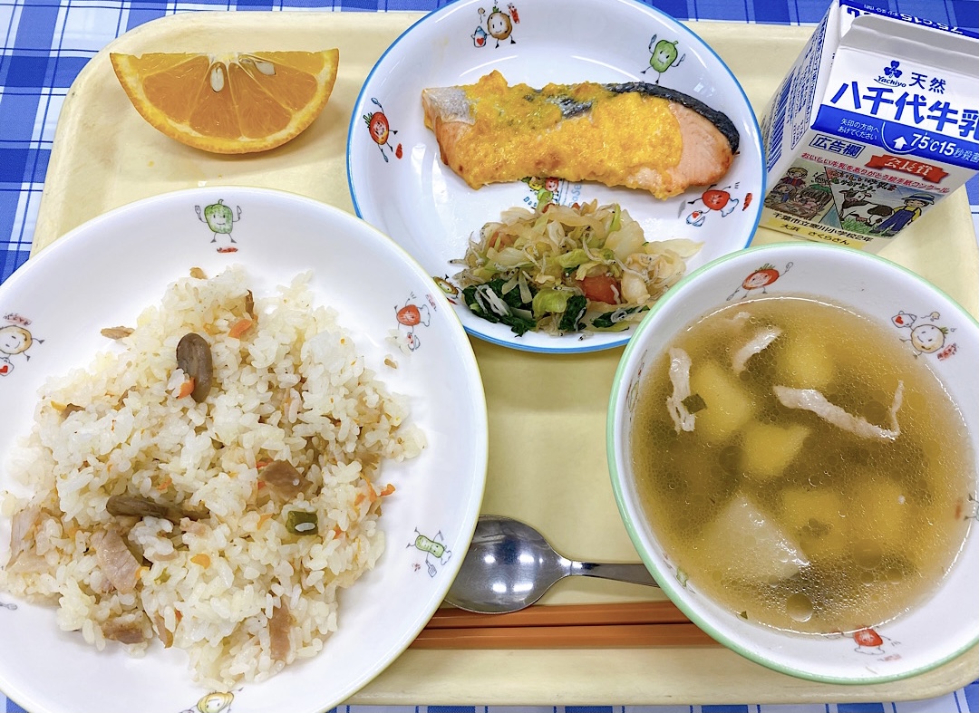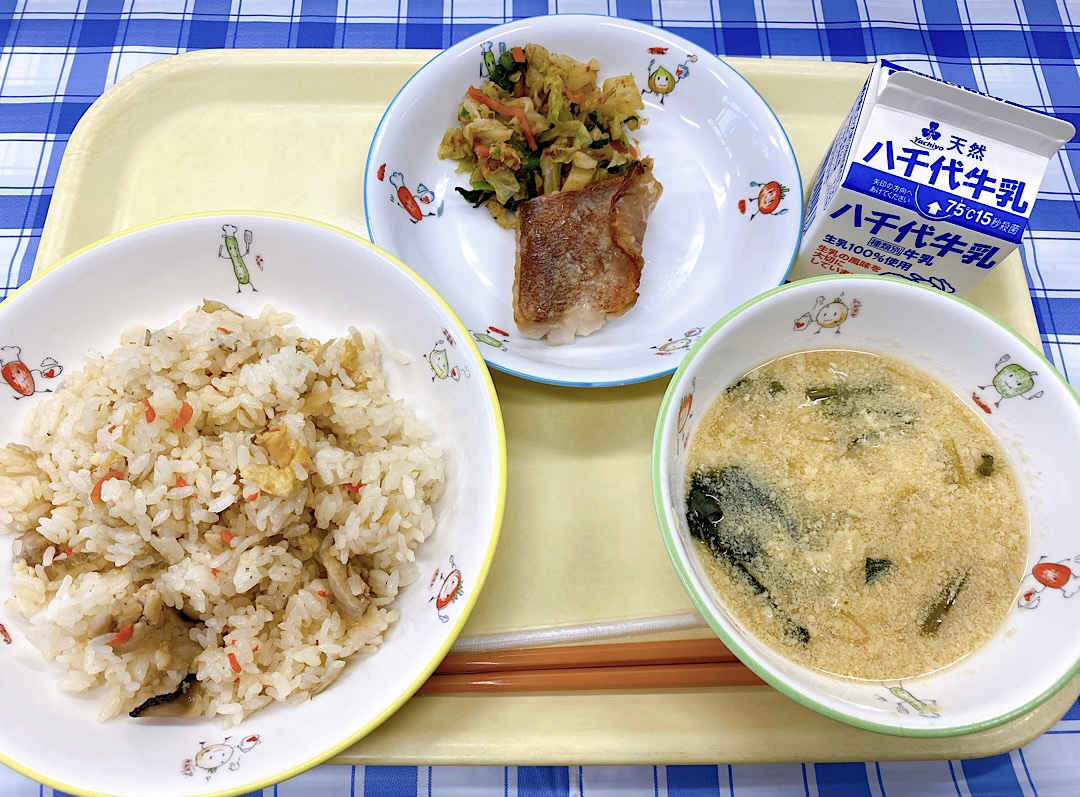 菜飯ごはん、いなだの西京焼き、生揚げの味噌汁、お米のババロア(みかん)、牛乳
