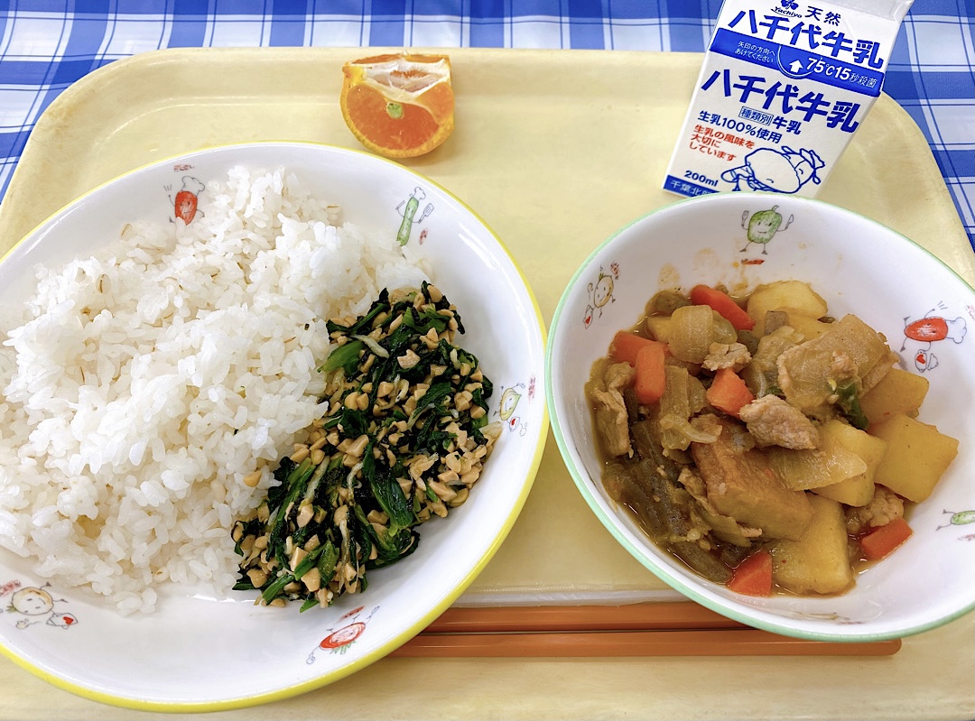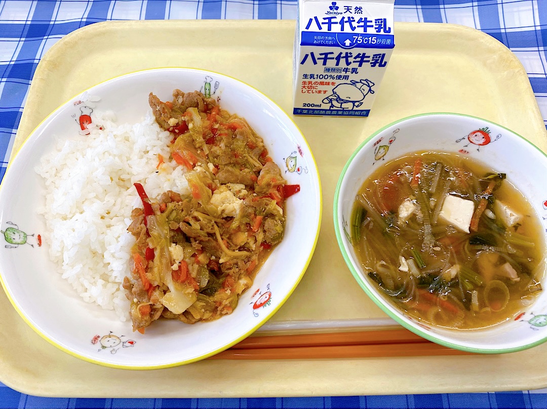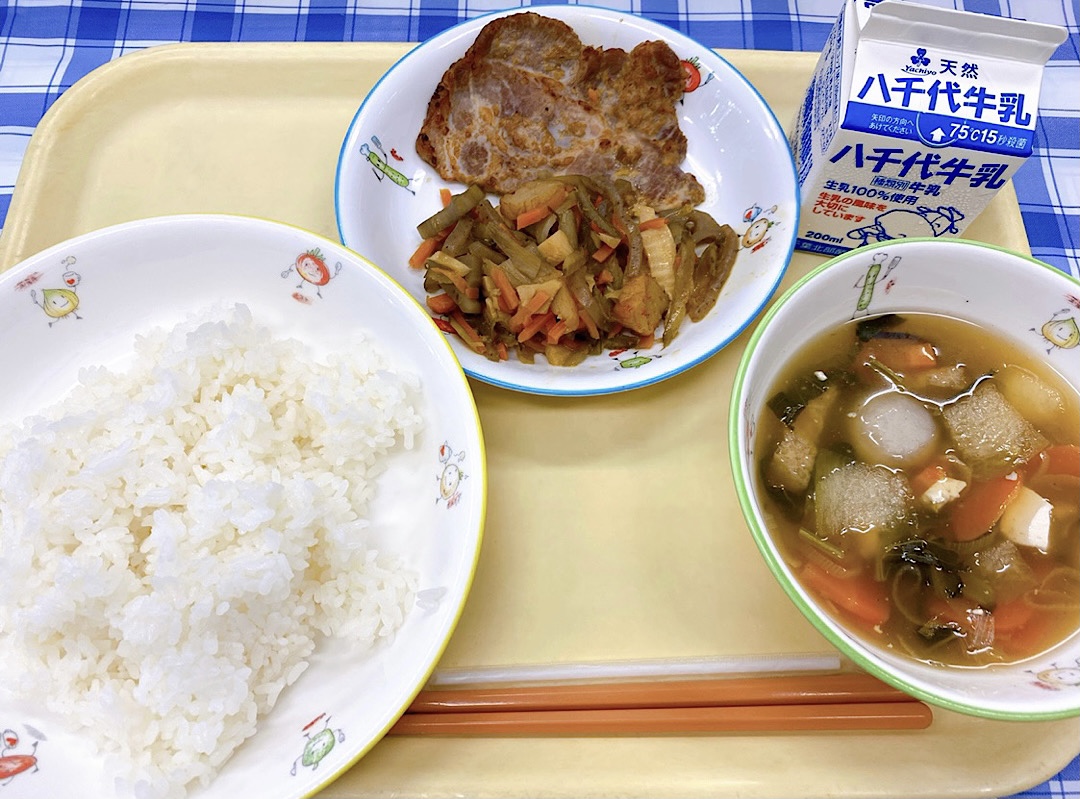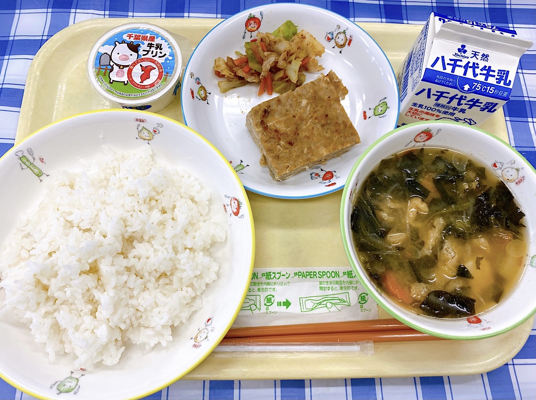 牛乳、米、のり、豚肉、小松菜、にんじん、ねぎ、大根、ごぼう、さつまいも、せいがく餅(せいがく餅とはうるち米で出来たお餅で、千葉の伝統食材です)