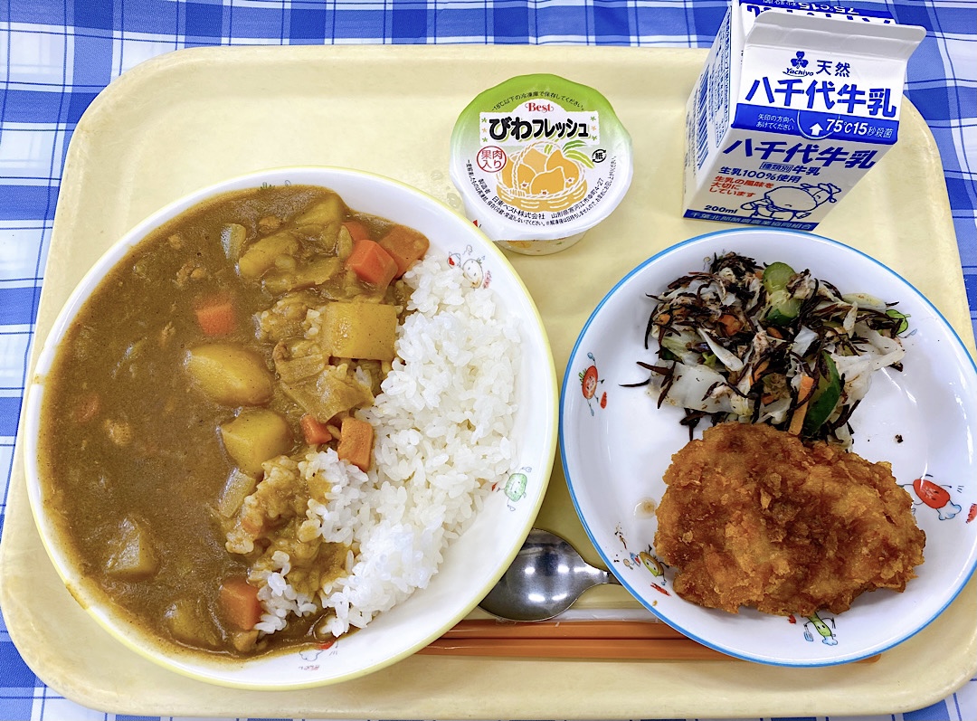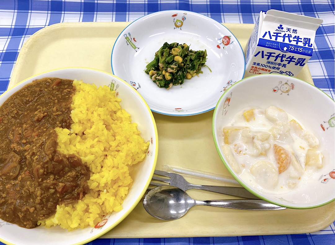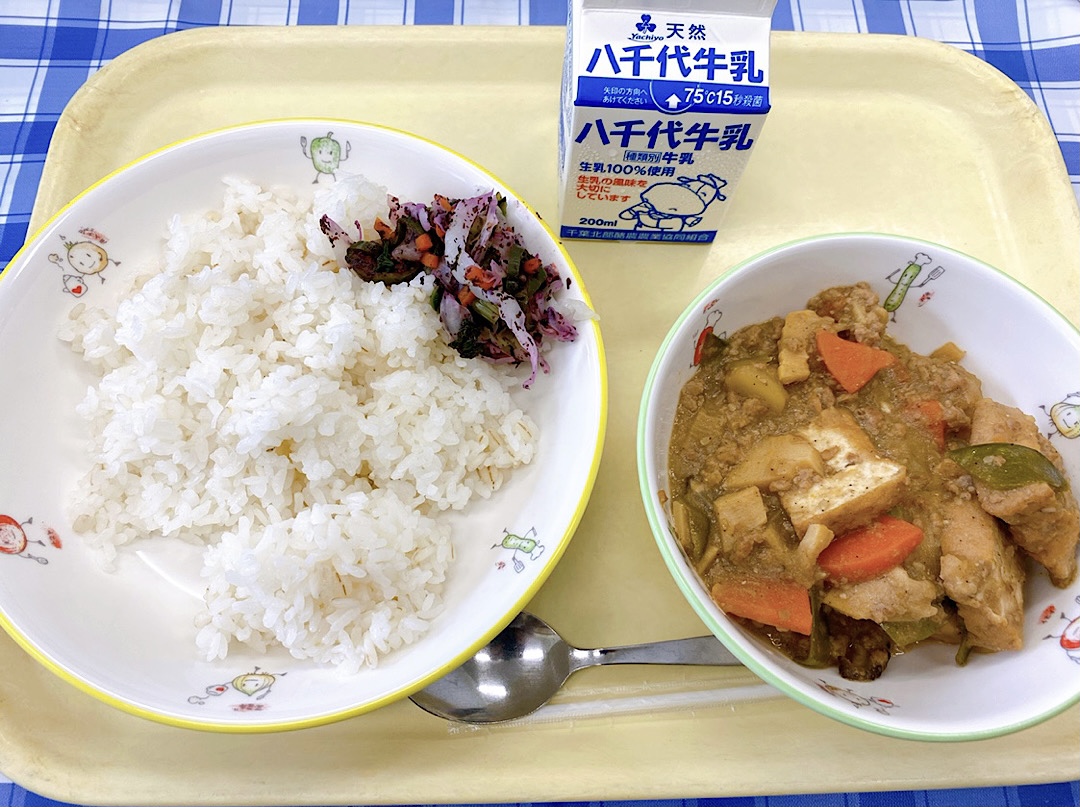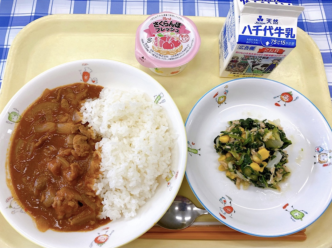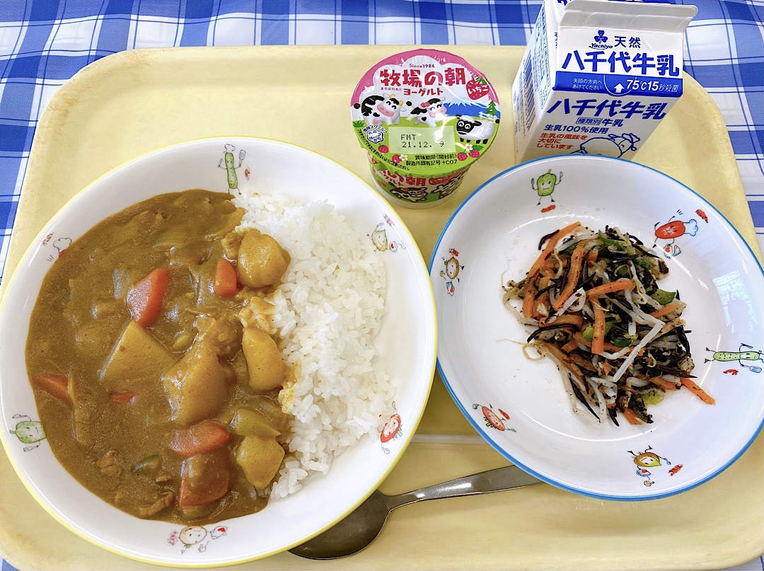 ごはん、ポークカレー、ひじきのマリネ、いちごヨーグルト、牛乳