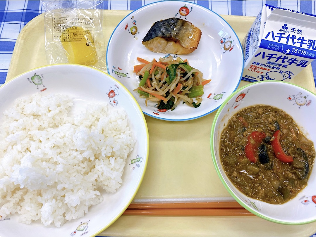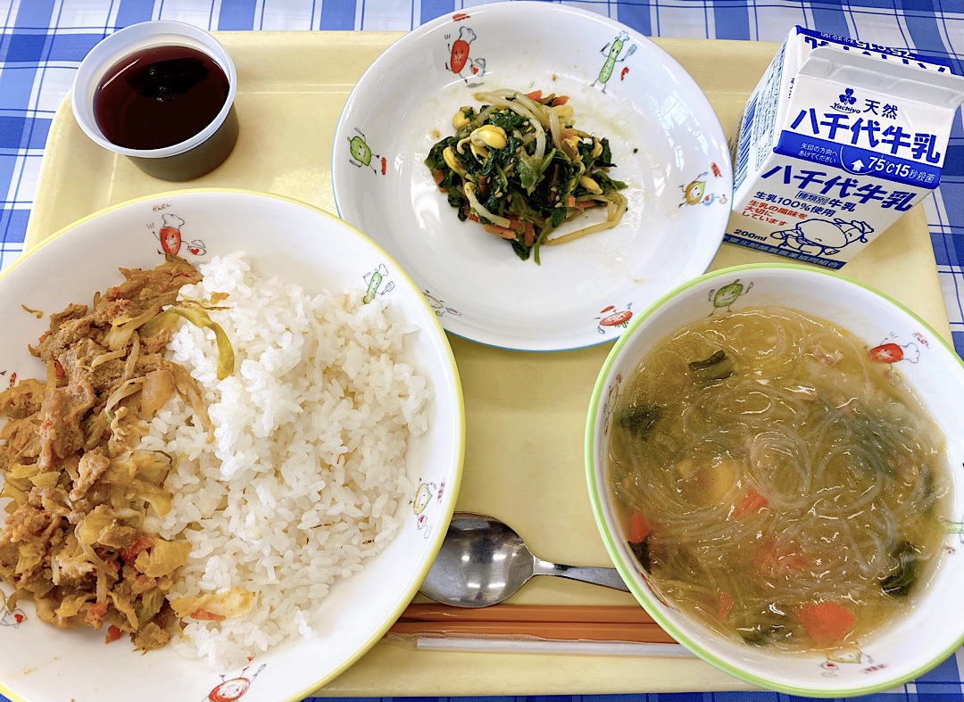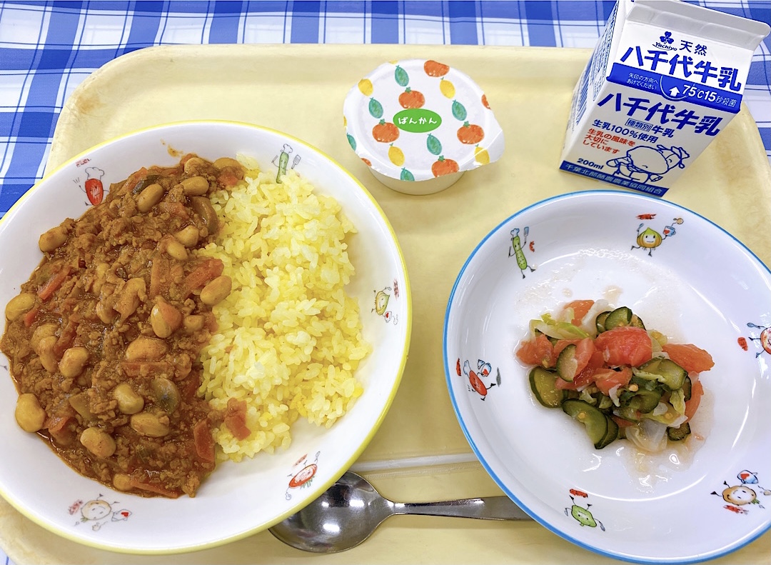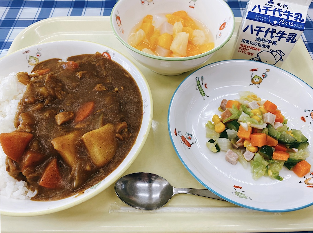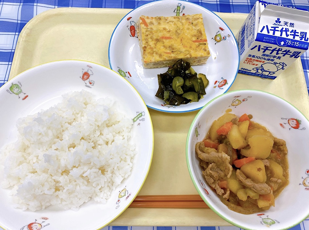 ごはん、ポークカレー、ひじきのマリネ、いちごヨーグルト、牛乳